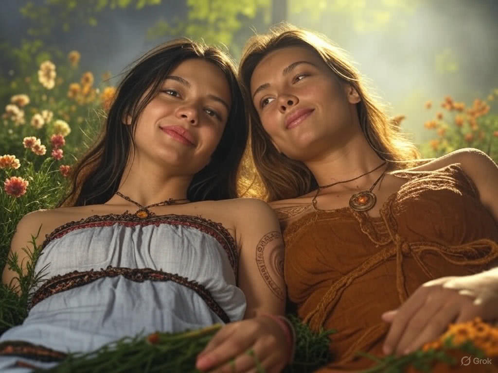 Milena zamknęła oczy, poddając się chwili. Boginka przyciągnęła ją bliżej, a ich usta złączyły się w pocałunku słodkim i głębokim, jak woda po długiej suszy. Pożądanie, dotąd Milenie nieznane, rozlało się po jej ciele. Las ożył wokół nich – szum drzew i plusk jeziora stały się muzyką ich bliskości. Boginka zrzuciła szaty, ukazując ciało doskonałe, a Milena, oczarowana, uczyniła to samo. Ich dłonie splatały się w tańcu, a każdy dotyk był zaklęciem, które wiązało je mocniej.
