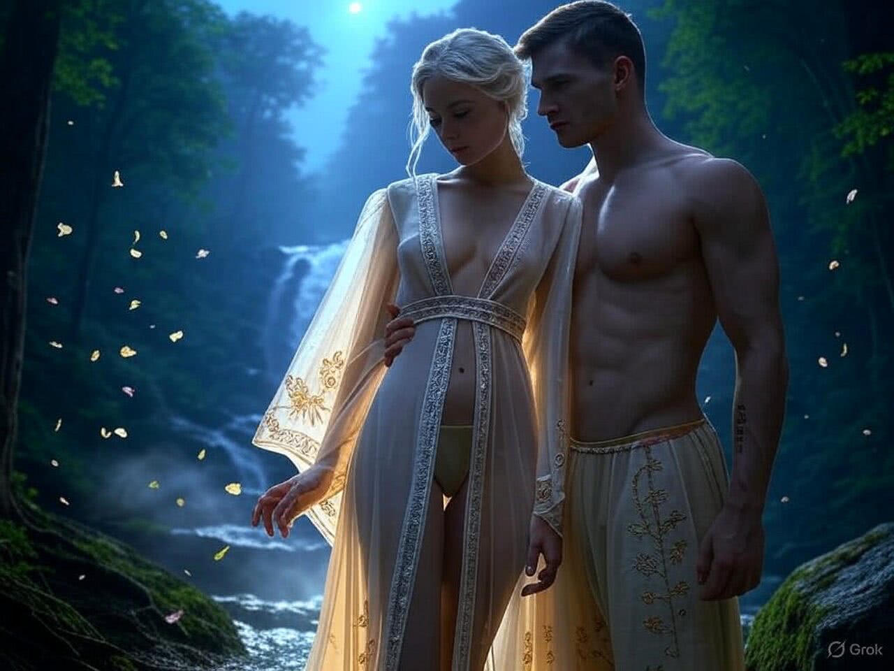 Ich spotkania stały się nocnym rytuałem. Każde było bardziej intensywne, pełne magii i erotyzmu. Liliana uczyła Mirosława tajemnic lasu, języka drzew i sekretów gwiazd. W zamian ofiarował jej miłość i oddanie. Pewnej nocy, pod baldachimem świetlików, zaprowadziła go do ukrytego gaju. Powietrze było ciężkie od zapachu jaśminu, a w oddali szumiał wodospad. Liliana zrzuciła szaty, odsłaniając swe ciało, a Mirosław, oczarowany, poddał się jej woli. Ich miłość była jak symfonia zmysłów, a las zdawał się celebrować ich jedność. Lecz gdy świt nadchodził, Liliana zmieniła się. Cień smutku przesłonił jej twarz. „Mirosławie, muszę ci coś wyznać,” rzekła cicho.