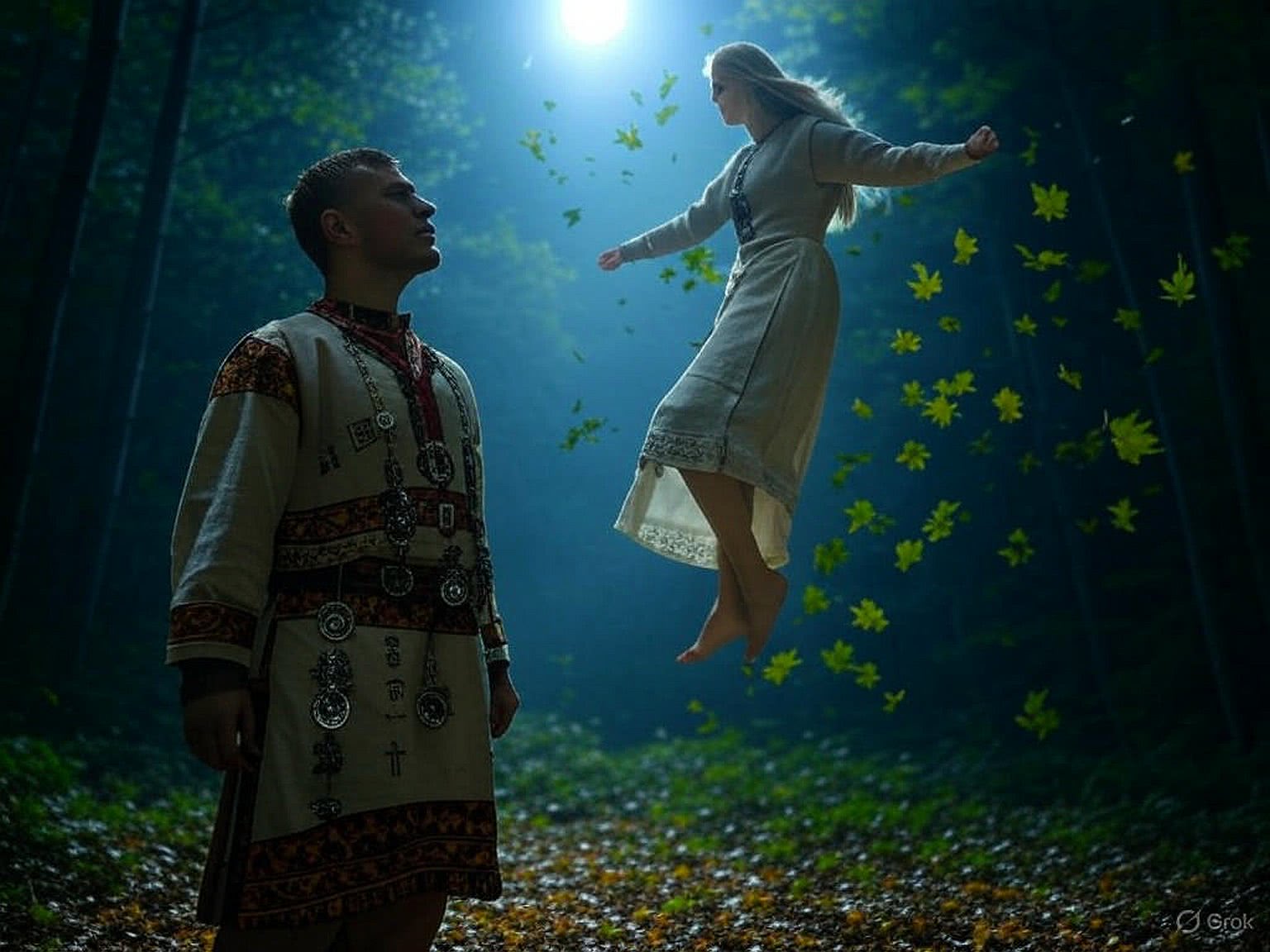 W dniach po święcie Mirosław zaczął dostrzegać subtelne zmiany. Las zdawał się bardziej żywy, liście szeleściły tajemniczo, a wiatr niósł melodyjne szepty. Pewnego wieczoru, idąc ustronną ścieżką, usłyszał głos wołający jego imię. „Mirosławie,” śpiewał miękko i uwodzicielsko. Odwrócił się, ale nikogo nie zobaczył. Głos powtórzył się, prowadząc go głębiej w las. Dotarł do polany skąpanej w księżycowym blasku, gdzie stała eteryczna postać. Była to Liliana, Wija o urodzie zapierającej dech. Jej długie włosy lśniły jak gwiazdy, a oczy miały głębię nocnego nieba. Mirosław czuł, jak serce bije mu mocniej, a granica między jawą a snem zaciera się.