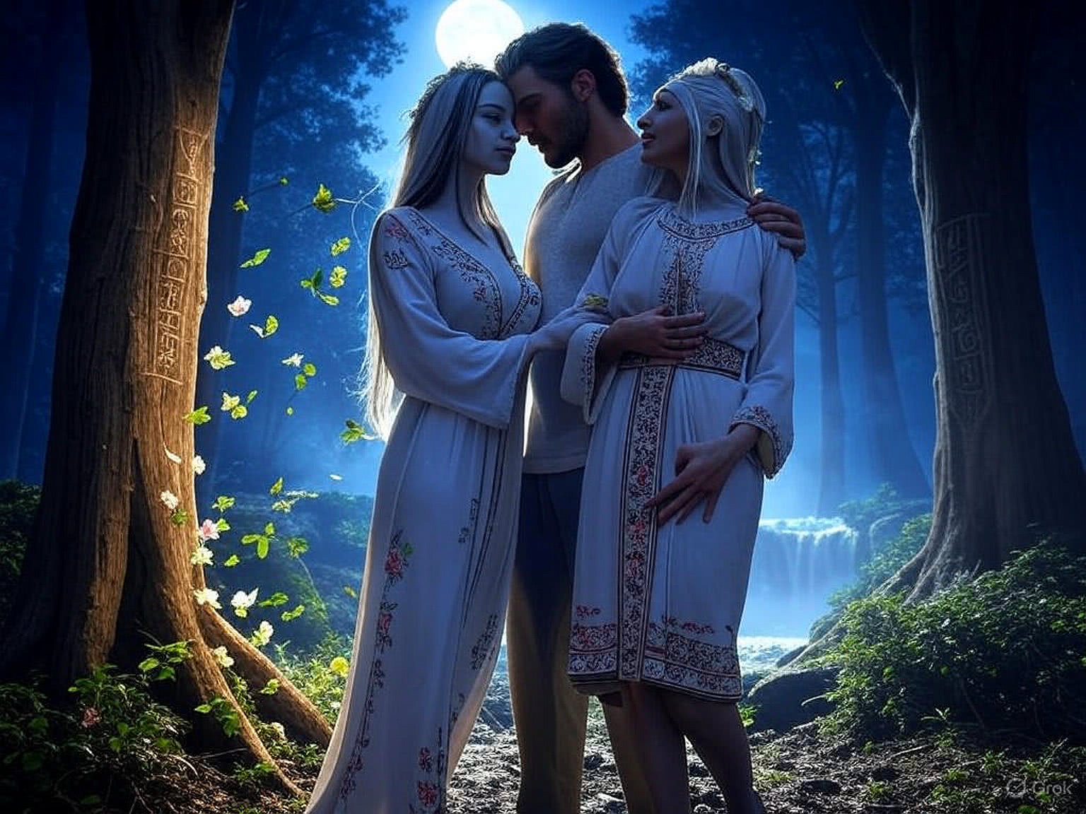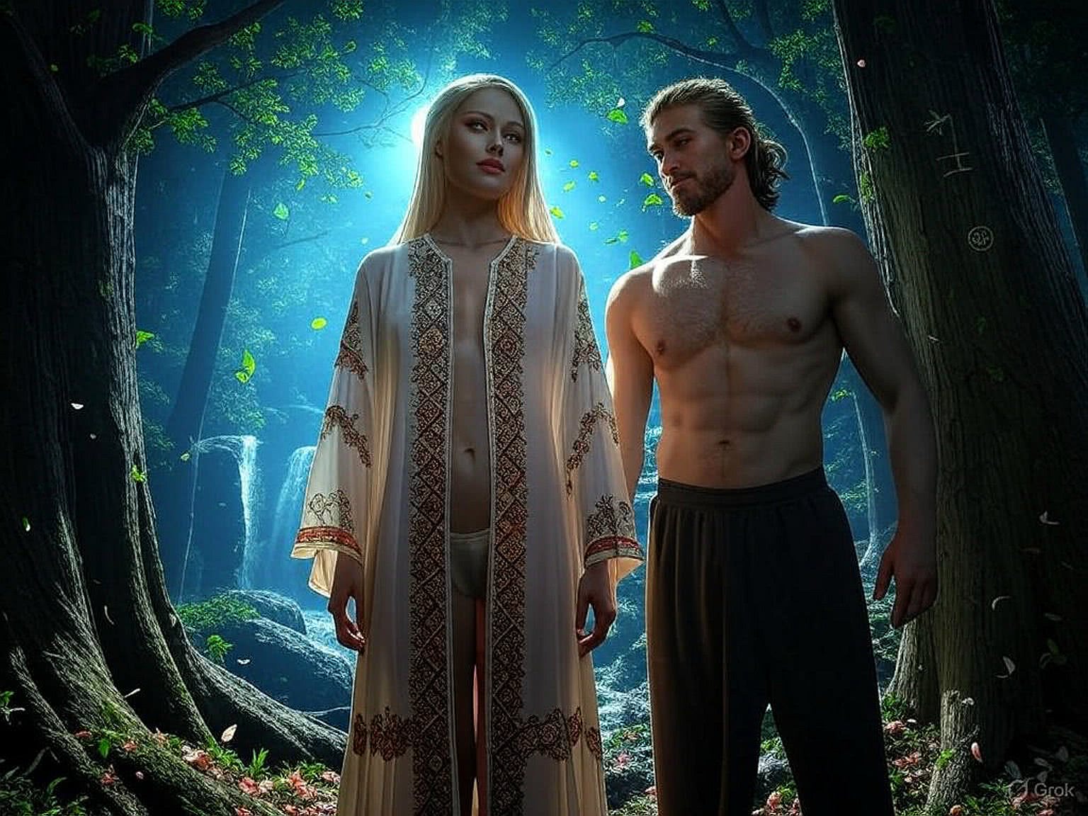 Ich spotkania stały się nocnym rytuałem. Każde było bardziej intensywne, pełne magii i erotyzmu. Liliana uczyła Mirosława tajemnic lasu, języka drzew i sekretów gwiazd. W zamian ofiarował jej miłość i oddanie. Pewnej nocy, pod baldachimem świetlików, zaprowadziła go do ukrytego gaju. Powietrze było ciężkie od zapachu jaśminu, a w oddali szumiał wodospad. Liliana zrzuciła szaty, odsłaniając swe ciało, a Mirosław, oczarowany, poddał się jej woli. Ich miłość była jak symfonia zmysłów, a las zdawał się celebrować ich jedność. Lecz gdy świt nadchodził, Liliana zmieniła się. Cień smutku przesłonił jej twarz. „Mirosławie, muszę ci coś wyznać,” rzekła cicho.