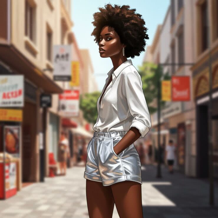 Modern air brush illustration: of a woman of African descent with a short afro and dark, naturally glowing skin, wearing silver metallic-accented shorts and a simple white blouse, standing on a bustling urban street during a hot summer day. Her hair is slightly tousled by the wind, adding a dynamic feel. The background features a busy cityscape with tall buildings and shops, illuminated by bright sunlight, creating a lively yet focused atmosphere around her. The scene uses vibrant colors and details to emphasize her stylish yet comfortable summer outfit and the energetic urban environment without overwhelming the main subject. IMAGE STYLE: Use a vivid color palette. The background should be blurred.