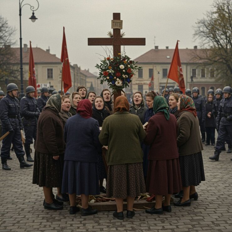 Modern air brush illustration: A high-resolution black and white photograph of a group of women forming a protective chain around a wooden cross in a New Huta square during the 1960s, set during the day under overcast skies. The women, dressed in period-appropriate clothing, show determined expressions as they sing, their focus on the cross. In the background, milicjants wearing helmets and carrying batons and tear gas canisters are visible, creating a tense atmosphere. The scene captures the community’s solidarity and determination against communist authority, with a retro style reminiscent of an archival photograph. The composition centers on the women and the cross, with the background slightly blurred to maintain focus on the main subjects. Use a vivid color palette of soft warm colors with a touch of brown and earthy green, red and orange for an accent.