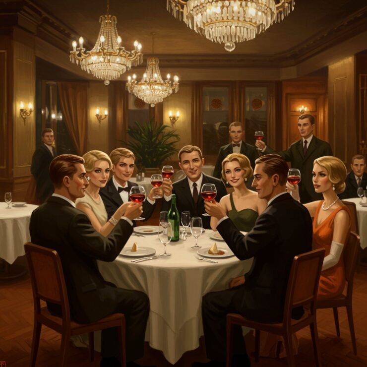 Modern air brush illustration: of an elegant restaurant interior in the style of the Polish People’s Republic, featuring a group of guests in formal attire seated at a central table. The guests, including men in suits and women in evening gowns, are raising glasses of cognac and wine, symbolizing luxury and social status. The table is set with white tablecloths and fine diningware. The background shows a dimly lit dining room with crystal chandeliers and retro decor typical of the 1960s-70s, creating a warm, nostalgic atmosphere. The focus is primarily on the guests, with soft, ambient lighting enhancing the intimate and luxurious setting. Use a vivid color palette of soft warm colors with a touch of brown and earthy green, red and orange for an accent.