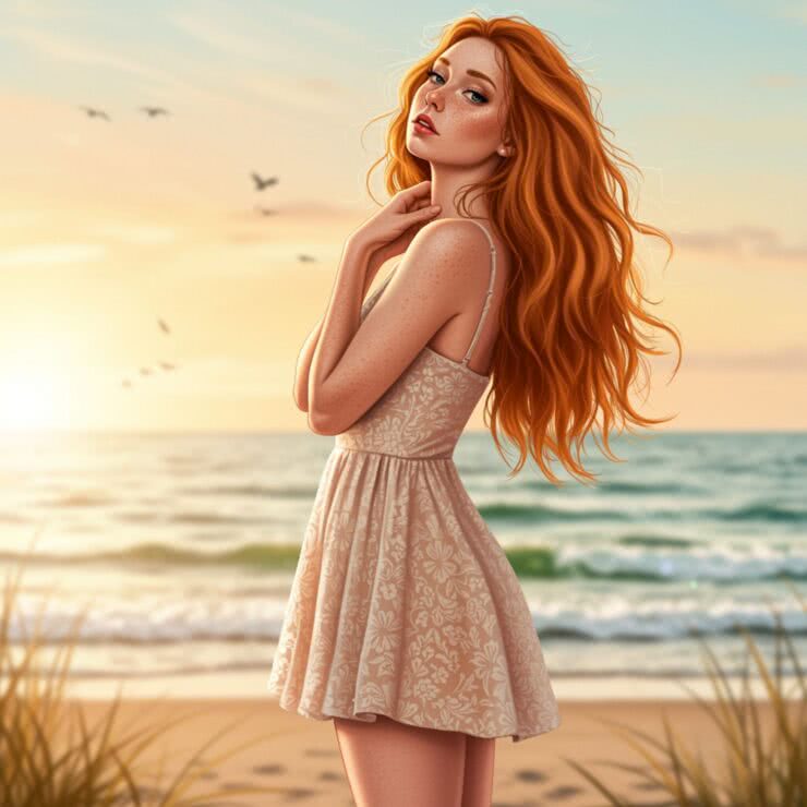 Modern air brush illustration: of a red-haired woman with pale skin and freckles, wearing a boho chic mini dress with lace, a V-neckline, and a gathered bodice. The dress has thin straps and a flowing bottom just above the knees. She has long, wavy hair with a curtain bangs fringe and poses in a three-quarter view with a slight body twist, her head slightly tilted, one hand along her side, and the other delicately touching her neck. The background features a sunny beach landscape with a clear sky and gentle waves, creating a romantic and natural setting. The lighting is soft and natural, enhancing the serene atmosphere without harsh shadows. IMAGE STYLE: Use a vivid color palette. The background should be blurred.