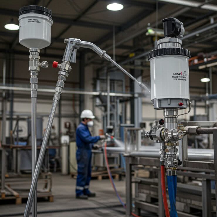 Modern professional industry photography: of various industrial painting accessories, including extenders, lances, elbows, nozzles, fittings, hoses, and filters, in use within a factory setting. The focus is on the detailed machinery and the painting process, with a worker in protective gear visible in the background but not the main focus. The scene is lit by overhead industrial lights, highlighting the metallic textures of the equipment. The background features metal structures typical of a factory environment, maintaining a realistic and focused composition without any distracting elements like text or additional foreground objects. IMAGE STYLE: Use a vivid color palette