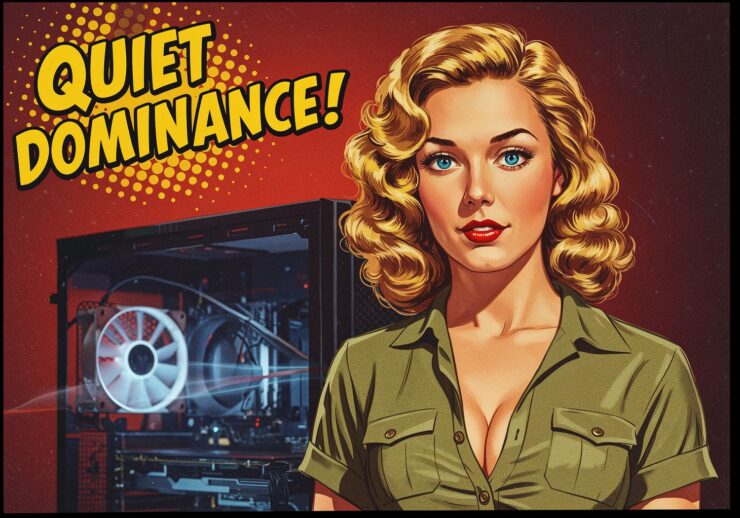 Kobieta prezentuje: A high-performance PC case with Noctua NF-A12x25 fans installed on the front panel, glowing softly in a quiet, modern gaming setup surrounded by subtle sound-dampening waves fading into silence, evoking 2025 tech dominance. The text reads in large yellow comic-book font: 'Quiet Dominance!’ Background is one color and blurred.