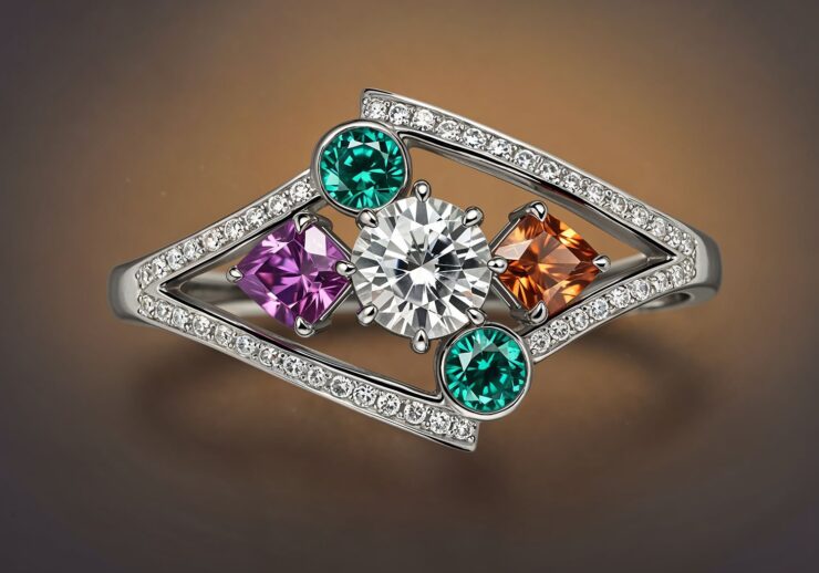 Modern air brush illustration: Modern air brush illustration: Stwórz elegancką ilustrację do artykułu o kamieniach szlachetnych w designie biżuterii, pokazującą harmonijną kompozycję różnych klejnotów osadzonych w złotym metalu. W centrum umieść owalny diament w brilliant cut, otoczony rubinem w kroplowatym kształcie, szafirem kwadratowym i szmaragdem baryłkowym. Dodaj subtelne elementy jak topaz żółty, ametyst fioletowy i akwamaryn turkusowy w asymetrycznej oprawie, z motywami organicznymi inspirowanymi naturą, takimi jak liście i fale. Tło delikatne, złote z lekkim blaskiem, w stylu luksusowym i minimalistycznym, podkreślającym kolory, kształty i blask szlifów, w wysokiej rozdzielczości, realistycznej grafice cyfrowej. IMAGE STYLE: Use a vivid color palette of soft warm colors with a touch of purple, red and orange for an accent. The background should be blurred. IMAGE STYLE: Use a vivid color palette of soft warm colors with a touch of purple, red and orange for an accent. The background should be blurred.