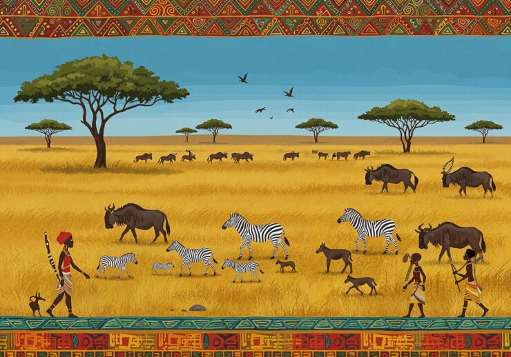 full of sunshine and warmth. A vast African savanna landscape with golden grasslands stretching to the horizon, dotted with umbrella-shaped acacia trees under a bright blue sky. In the foreground, a massive herd of zebras and wildebeest migrates across the plain, kicking up dust as they move toward a distant river, with young calves among the group and distant silhouettes of other animals like gazelles. Vibrant African folk art and storytelling style, featuring bold geometric patterns and motifs in background