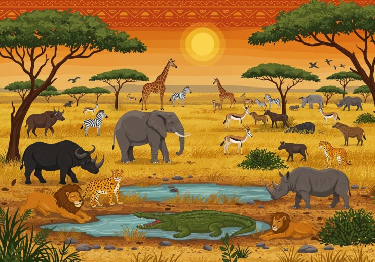 full of sunshine and warmth. A vast African savanna landscape under a hot sun, with golden grasslands and scattered acacia trees. In the foreground, a pride of lions rests near a watering hole, while an elephant herd led by a matriarch drinks water. Nearby, a group of African buffaloes grazes, a black rhinoceros browses on bushes, a white rhinoceros stands with its calf, and a leopard lurks in the shadows of a tree. In the background, zebras and gazelles migrate, with a crocodile partially submerged in the water and hyenas watching from afar, illustrating the interconnected wildlife ecosystem. Vibrant African folk art and storytelling style, featuring bold geometric patterns and motifs in background