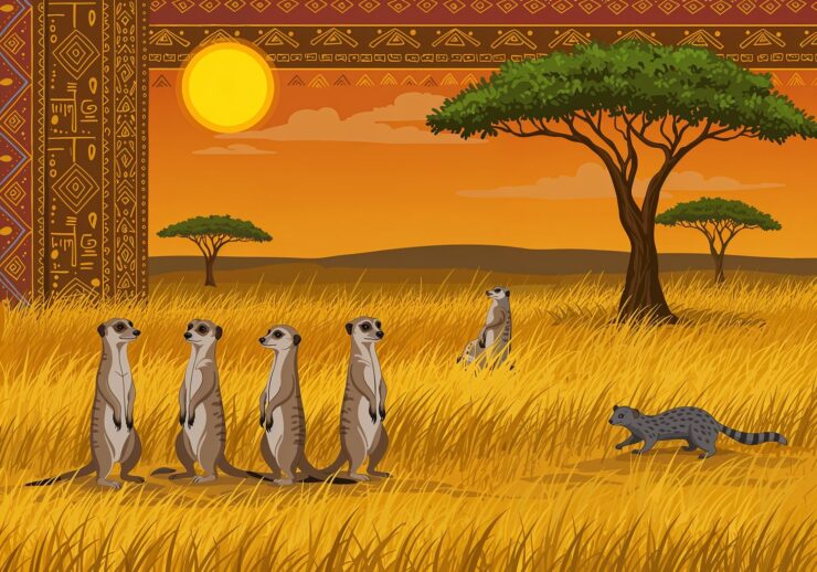 full of sunshine and warmth. A group of meerkats standing upright on their hind legs as sentinels on the golden savanna grasslands, scanning the horizon for predators, while a grey mongoose darts through the tall grass nearby hunting for insects, and a genet climbs a sparse acacia tree in the background under a hot African sun. Vibrant African folk art and storytelling style, featuring bold geometric patterns and motifs in background