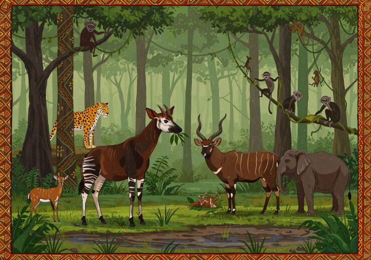 full of sunshine and warmth. A lush, dense rainforest in Central Africa with tall trees forming a green canopy, misty air from frequent rain, and a muddy forest floor. In the foreground, an okapi with zebra-like stripes on its hind legs and a long neck grazes on leaves, while a small duiker antelope hides among bushes nearby, and a majestic bongo with twisted horns stands on a clearing eating grass. In the background, a leopard lurks on a tree branch, a forest elephant browses fruits, and monkeys climb vines, illustrating the interconnected ecosystem of herbivores, predators, and competitors. Vibrant African folk art and storytelling style, featuring bold geometric patterns and motifs in background