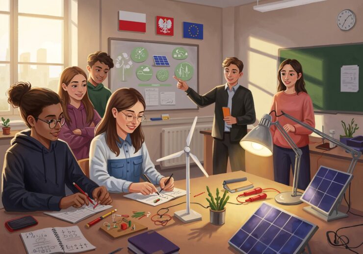 Modern air brush illustration: A vibrant educational illustration depicting a diverse group of enthusiastic school students aged 12-16 in a modern classroom laboratory, actively engaged in hands-on renewable energy experiments. In the foreground, one student assembles a small wind turbine model with plastic blades connected to a LED light that glows as a fan simulates wind, while another measures voltage from a solar panel under a lamp, using a multimeter. In the background, a teacher points to a wall chart showing icons of wind farms, solar panels, biomass, and geothermal sources, with Polish and EU flags subtly integrated. Sunlight streams through windows, casting warm light on notebooks with energy-saving calculations, evoking empowerment, curiosity, and environmental awareness in a clean, colorful style suitable for a blog header. IMAGE STYLE: Use a vivid color palette of soft warm colors with a touch of purple, red and orange for an accent. The background should be blurred.