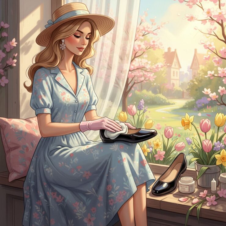 Modern air brush illustration: A vibrant illustration of a stylish woman in a spring outfit gently polishing a pair of elegant black patent leather ballet flats with a soft microfiber cloth and specialized cream, set on a sunlit windowsill with blooming flowers and soft morning light filtering through, emphasizing the shoes’ glossy shine and flawless condition, in a realistic yet whimsical style with warm pastel tones. IMAGE STYLE: Use a vivid color palette. The background should be blurred.