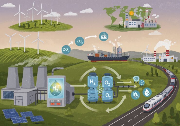 Modern air brush illustration: A vibrant, illustrative diagram depicting the lifecycle of green hydrogen as a sustainable energy solution. In the foreground, show a modern electrolysis plant powered by renewable sources: wind turbines spinning on a sunny hillside and solar panels gleaming, with water being split into hydrogen gas (H2) and oxygen (O2) in a glowing electrolyzer device. Arrows illustrate the flow: hydrogen compressed into storage tanks or underground caverns, then transported via pipelines and tanker ships across a global map. In the background, depict utilization scenes – a hydrogen fuel cell truck driving on a highway emitting only water vapor, an industrial factory with clean turbines, and a train powered by fuel cells. Use eco-friendly colors like greens, blues, and whites, with icons for zero CO2 emissions and energy storage, in a futuristic, optimistic style to symbolize the bridge to a carbon-free future. IMAGE STYLE: Use a vivid color palette of soft warm colors with a touch of purple, red and orange for an accent. The background should be blurred.