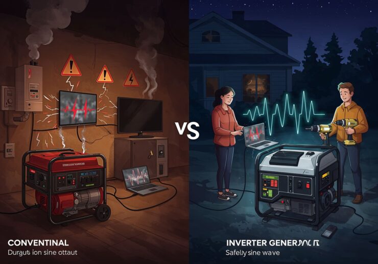 Modern air brush illustration: A split-scene illustration comparing conventional and inverter generators during a power outage: on the left, a rugged conventional generator with a distorted, jagged sine wave output connects to a sparking laptop, flickering TV, and malfunctioning gas furnace controller, showing smoke and warning icons for damage; on the right, a sleek inverter generator emits a smooth, clean sine wave, safely powering the same devices plus power tools like a drill and saw, with happy users and stable energy flow lines; nighttime setting with a dark house in the background, realistic style with technical wave diagrams integrated subtly. IMAGE STYLE: Use a vivid color palette of soft warm colors with a touch of purple, red and orange for an accent. The background should be blurred.