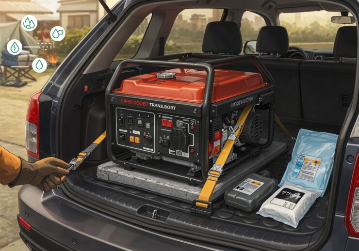 Modern air brush illustration: A realistic illustration of a car’s open trunk (hatchback or SUV) showing safe transport of a portable gasoline generator: the compact generator (about 50kg, with fuel tank and handles) is securely strapped down with ratchet straps to cargo tie-down points, placed on a thick rubber protective mat to prevent leaks, with a foam-wrapped fuel tank and tightly secured caps visible. Nearby, carbon absorber bags and a sealed plastic container option are depicted subtly. A gloved hand checks the straps, emphasizing safety. Background includes a suburban driveway with camping gear nearby, clean and odor-free atmosphere with subtle fresh air icons, in a bright, informative style suitable for a blog post. IMAGE STYLE: Use a vivid color palette of soft warm colors with a touch of purple, red and orange for an accent. The background should be blurred.