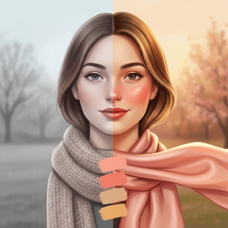 Modern air brush illustration: A vibrant digital illustration of a young woman with pale, winter-weary skin transforming into a radiant glow. On the left side, show her with a dull, matte complexion, tired expression, wearing neutral gray scarf against a grayish early spring background with soft diffused light. On the right side, depict the same woman smiling confidently, her face illuminated with warm peach and coral tones from a flowing peach silk scarf around her neck, subtle peach blush on cheeks, and coral lipstick, adding healthy rumience and vitality. Include subtle color swatches of peach, coral rose, and golden beige floating nearby, evoking seasonal color analysis. Style: soft, empowering, feminine, in a realistic yet illustrative aesthetic with warm lighting to highlight the before-and-after contrast. IMAGE STYLE: Use a vivid color palette. The background should be blurred.