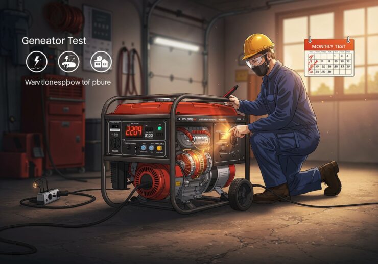 Modern air brush illustration: A realistic illustration for a blog post on generator maintenance: In a well-lit garage, a modern portable diesel generator is running smoothly on a concrete floor, connected via extension cords to a few household lights and a small appliance to simulate load. A technician in safety gear kneels nearby, checking a digital meter showing stable voltage (230V) and RPM (3000). Subtle cutaway views on the generator body reveal flowing oil lubricating flexible seals in the engine and warm air evaporating moisture from copper windings in the alternator. In the background, a calendar marks a monthly test date, with faint icons of a storm and blackout contrasted by a glowing reliable power symbol. Professional, informative style with clean lines, blue and orange tones for energy and safety. IMAGE STYLE: Use a vivid color palette of soft warm colors with a touch of purple, red and orange for an accent. The background should be blurred.