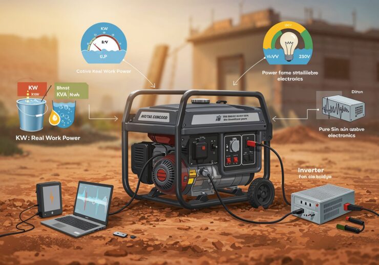 Modern air brush illustration: A vibrant, educational infographic illustration of a portable diesel generator in an outdoor setting, like a construction site or home backup during a power outage, powering everyday devices such as a laptop, light bulb, and power tool. Surrounding the central generator are clear, labeled icons and diagrams: a bucket analogy showing active power (kW) as clean water and apparent power (kVA) as water with air bubbles, a power factor (cosφ) gauge at 0.8, an AVR voltage stabilizer waveform keeping output steady at 230V, and an inverter converting „dirty” AC to clean sinusoidal wave. Include subtle text labels like „kW: Real Work Power” and „Inverter: Pure Sine Wave for Sensitive Electronics.” Style: clean, modern, semi-realistic with blue and yellow accents, beginner-friendly and informative, no text overload. IMAGE STYLE: Use a vivid color palette of soft warm colors with a touch of purple, red and orange for an accent. The background should be blurred.