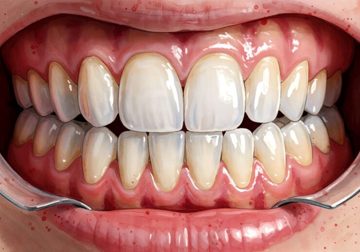 Watercolor concept art, dynamic, vivid color transitions, blurred edges, bold modern textures, warm light, scandinavian art style brush strokes, of: A close-up view of a patient’s bright smile showing front teeth restored with a full ceramic crown seamlessly blending with natural adjacent teeth, highlighting the crown’s translucent enamel-like structure and subtle light reflection for a natural aesthetic, with a subtle indication of underlying strength like a reinforced core. ;;Image without icons or texts. Medical-like style.