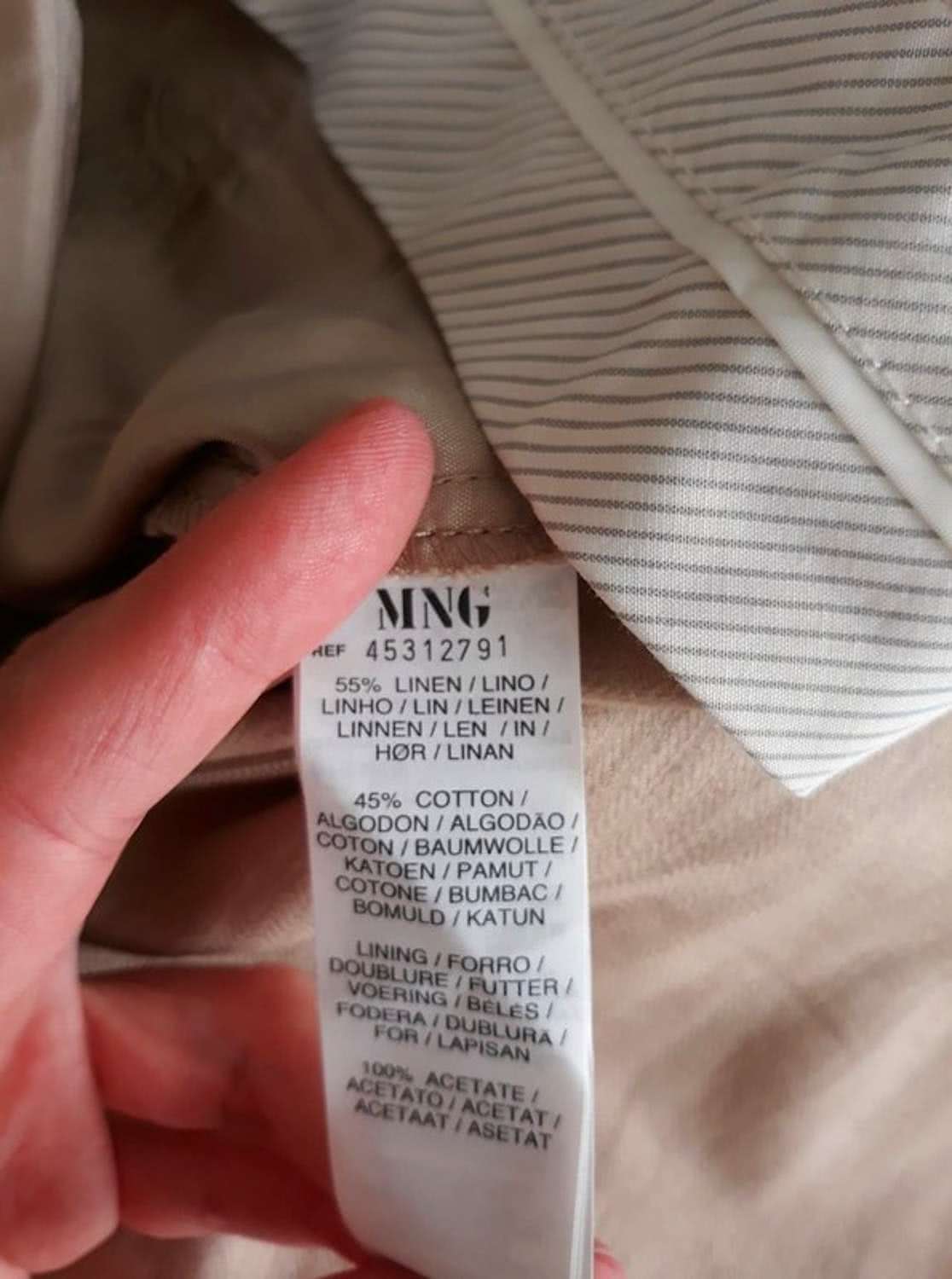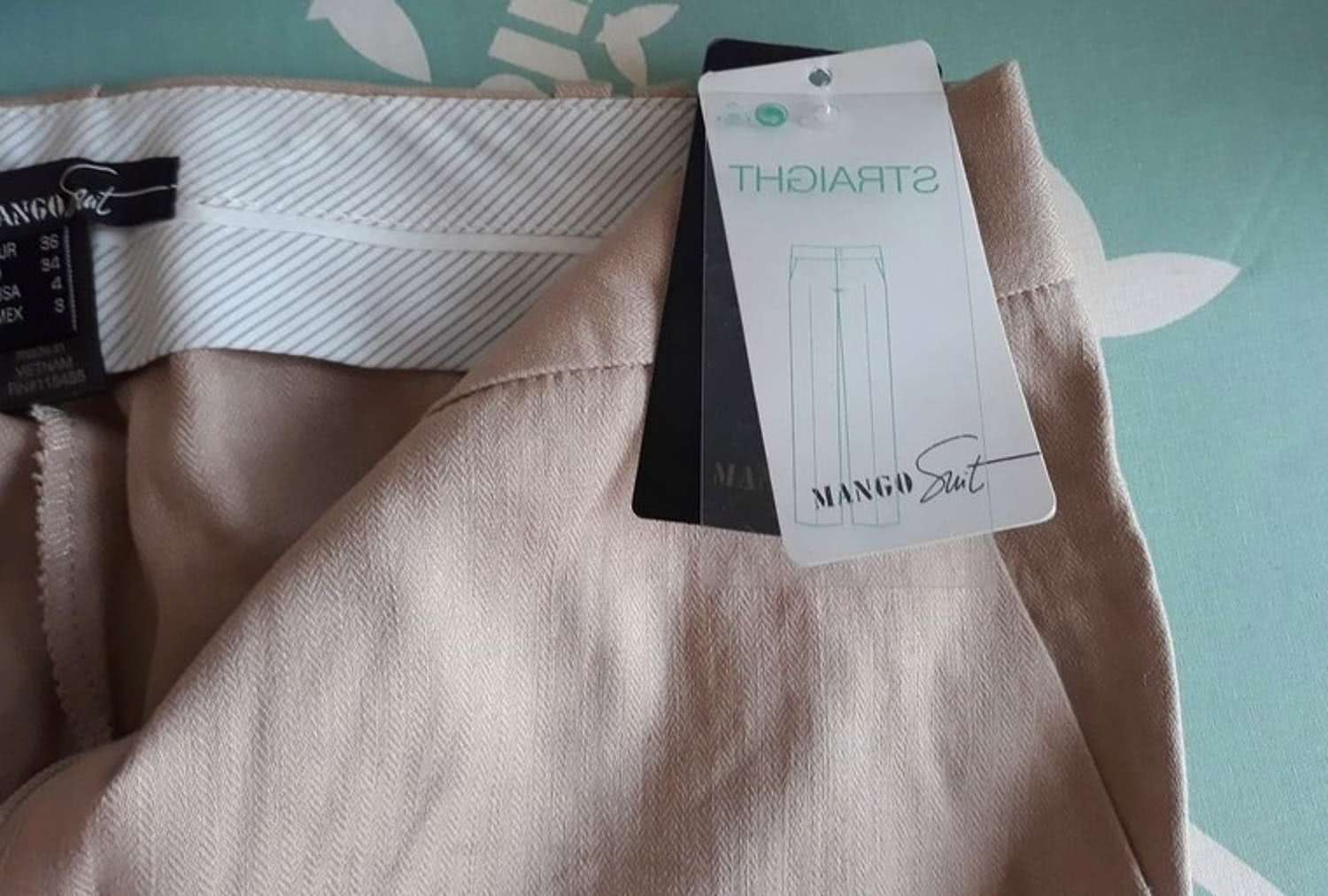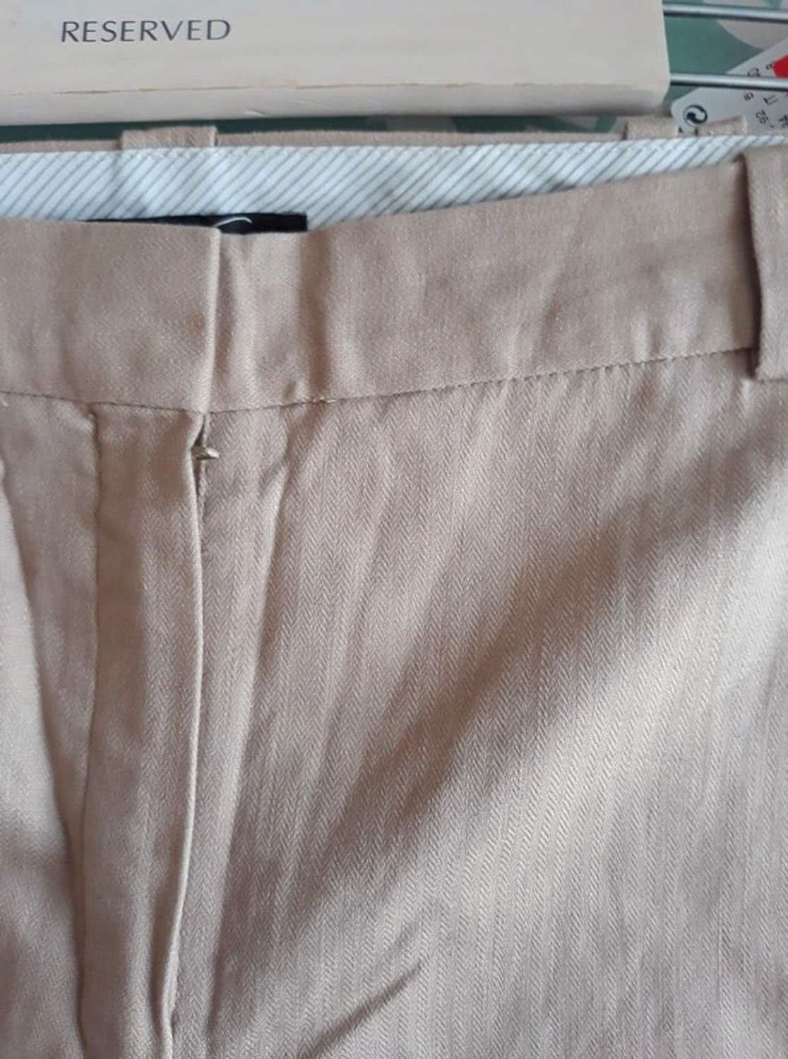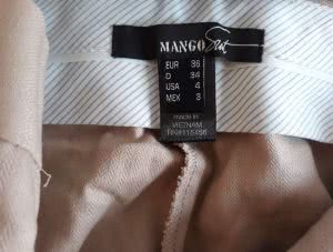 Spodnie typu garniturowego, fason w kant. Idealna na lato. Materiał strukturalny (delikatna jodełka). Kolor kawy z mlekiem, jasnego beżu. Prosta nogawka. Niższy stan. Linia Mango Suit.