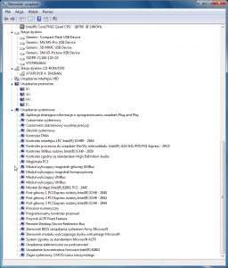 Zrzuty ekranu z programów CPU-Z, GPU-Z, Menadżer Urządzeń (jeszcze baz karty grafiki GeForce 9500GT)